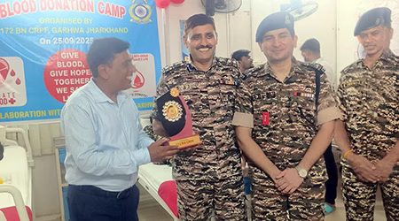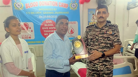 गढ़वा : आज दिनांक 25 सितंबर 2025 को 172 बटालियन सीआरपीएफ द्वारा कैंप अस्पताल परिसर में भव्य रक्तदान शिविर का आयोजन किया गया। इस शिविर की शुरुआत बटालियन के कमांडेंट अजय कुमार वर्मा ने स्वयं रक्तदान कर की। उनके प्रेरणादायी कदम का अनुसरण करते हुए बड़ी संख्या में अधिकारियों और जवानों ने भी उत्साह पूर्वक रक्तदान किया। इस अवसर पर द्वितीय कमान अधिकारी अमरेंद्र कुमार सिंह, कुलदीप कुमार एवं उमा कांत ओझा, उप कमांडेंट डॉक्टर शैंकी चंडोक, डॉक्टर आस्था कोहली तथा अमित किशोर सहायक कमांडेंट सहित अन्य अधिकारी भी उपस्थित रहे और इस पुनीत कार्य में योगदान दिया। इस आयोजन का उद्देश्य समाज के प्रति दायित्व निर्वहन एवं जीवन रक्षक रक्त की उपलब्धता सुनिश्चित करना था। कमांडेंट अजय कुमार वर्मा ने अपने संदेश में कहा कि रक्तदान महादान है और प्रत्येक जवान को राष्ट्र एवं समाज की सेवा के लिए सदैव तत्पर रहना चाहिए। 172 बटालियन सीआरपीएफ सदैव समाजोपयोगी कार्यों में अग्रणी रही है और भविष्य में भी ऐसे जनहितकारी कार्यक्रमों का आयोजन करती रहेगी।